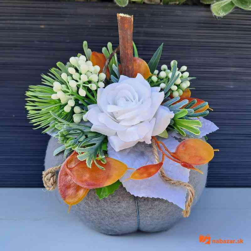 Textilná tekvica dozdobená umelými kvetmi.