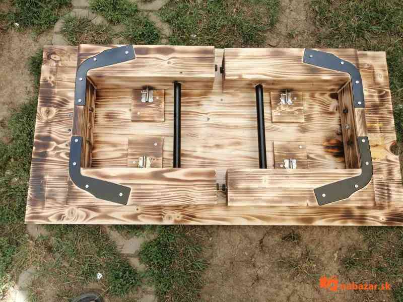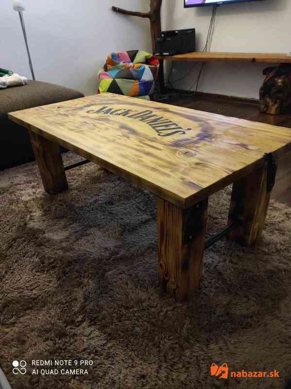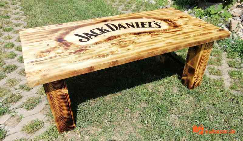 Konferenčný stolík z masívneho dreva, ručne vypaľovane s motívom Jack Daniels