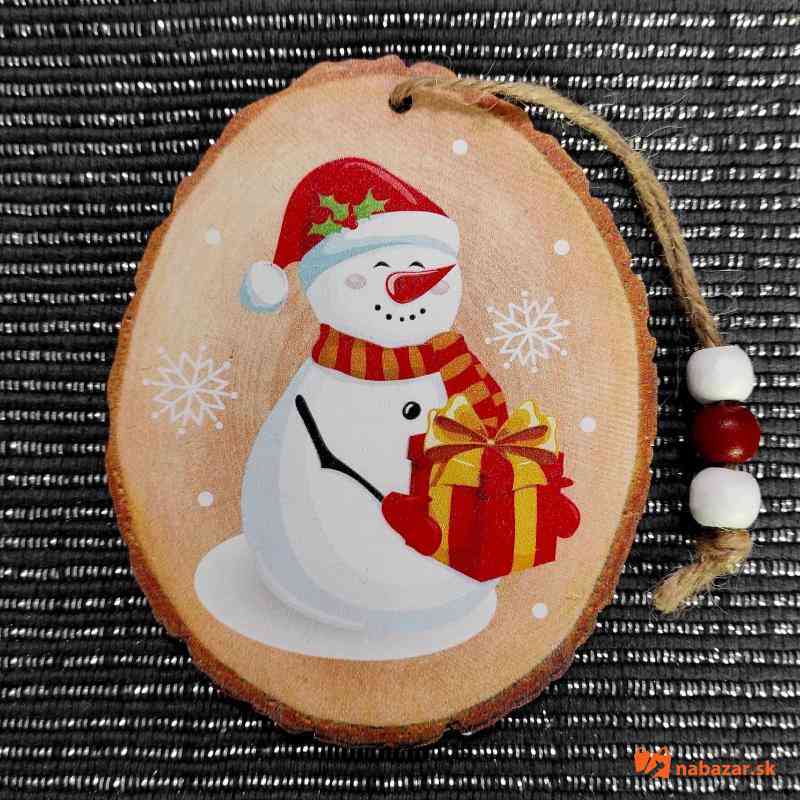Krásny rozprávkový Snehuliak na drevenom podklade, celková dĺžka 11 cm + špagátik na zavesenie s korálkou.