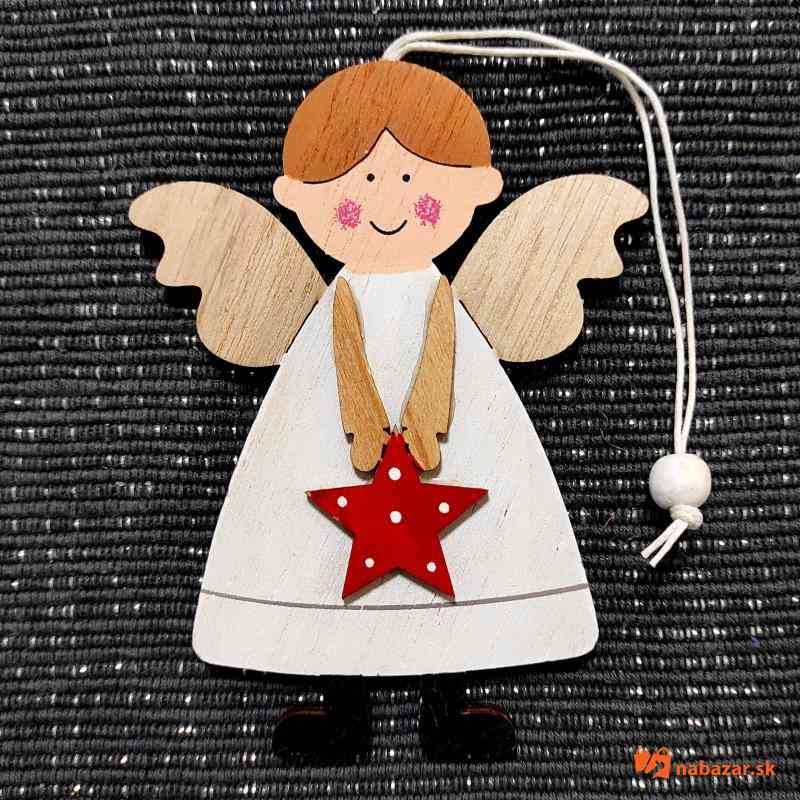 Anjelik v bielych šatách s červenou hviezdičkou v rukách, celková dĺžka 11 cm + špagátik na zavesenie s korálkou.