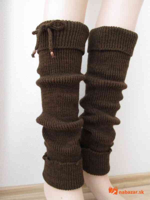 Návleky jsou upleteny pružným vzorem, nahoře je šňůrka na stažení a zároveň návleky zdobí. Na konci šňůrky jsou lakované dřevěné korálky. Mašlička může být vpředu nebo po straně. Návleky mají šev.
