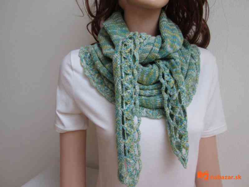 Originální pletený šátek je ozdobně obháčkovaný. Může se nosit na mnoho způsobů, je oboustranný.