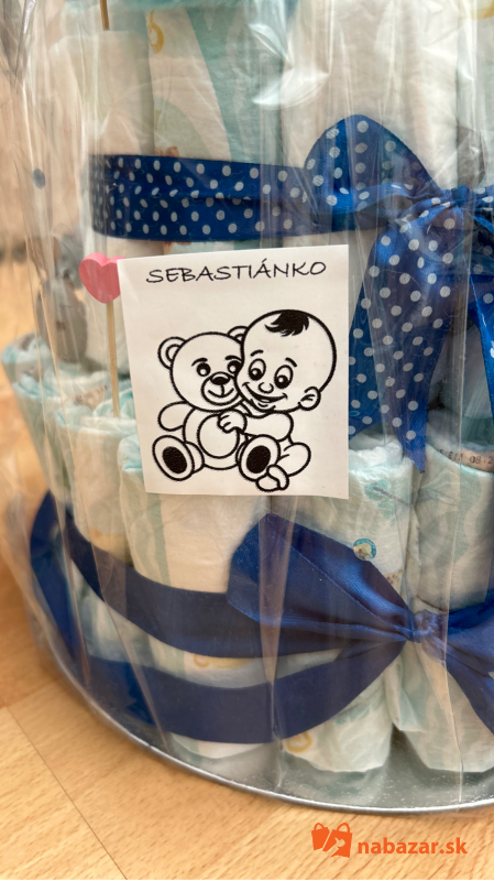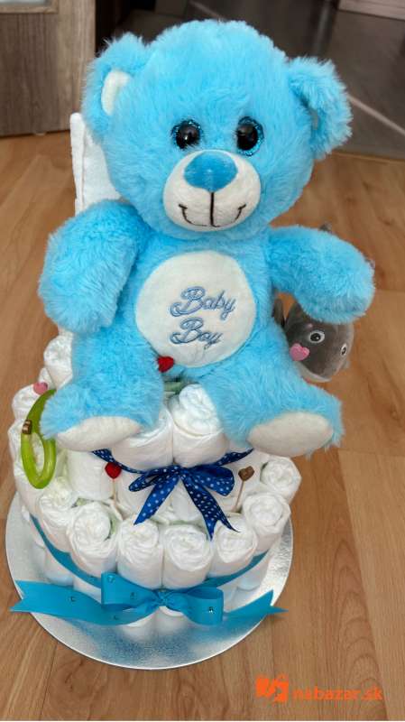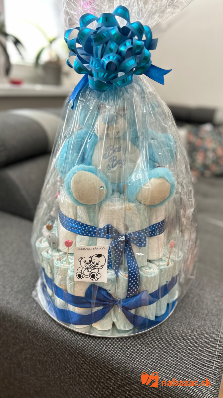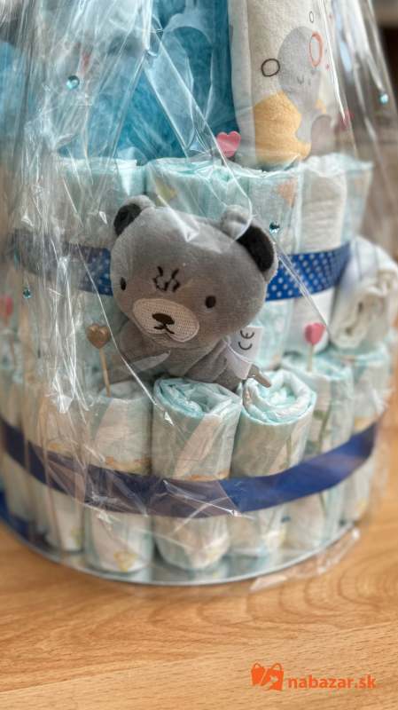 Príklad:torta na obrázku je pre chlapca ktorá obsahuje 65ks pampers 2 premium care, veľký macko,detskú knižku latkovu,hryzatko,šnúrka na cumlík,látková plienka.