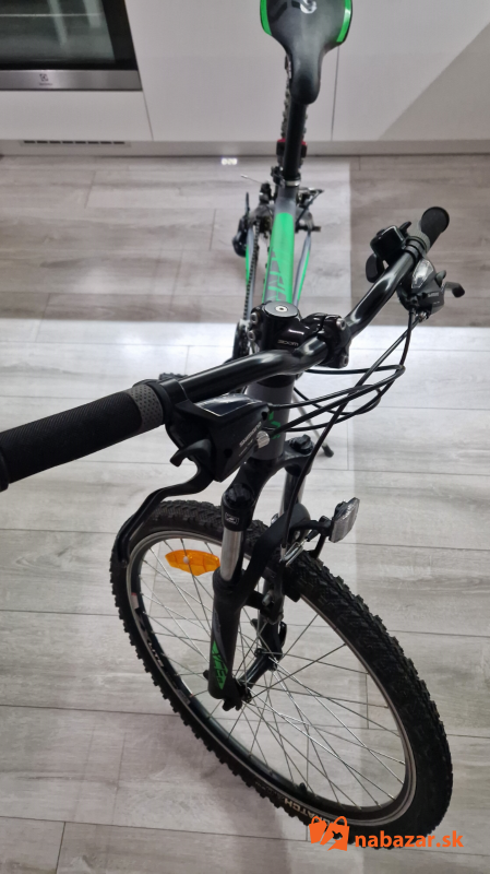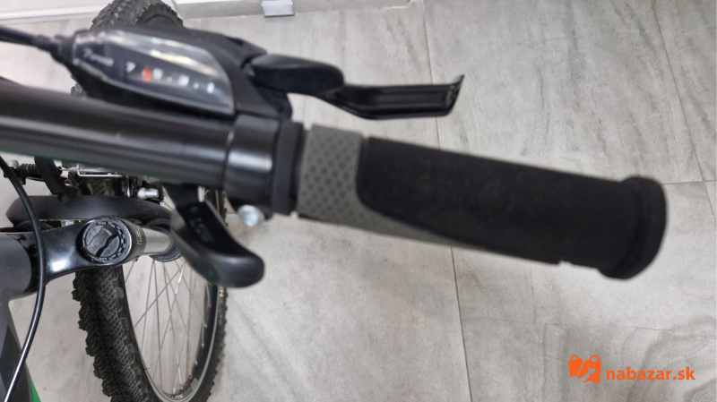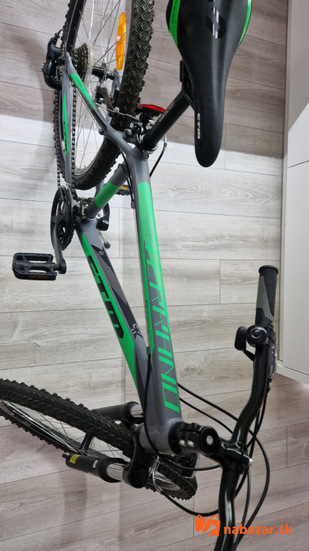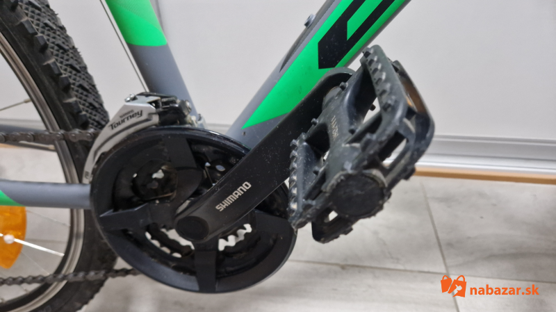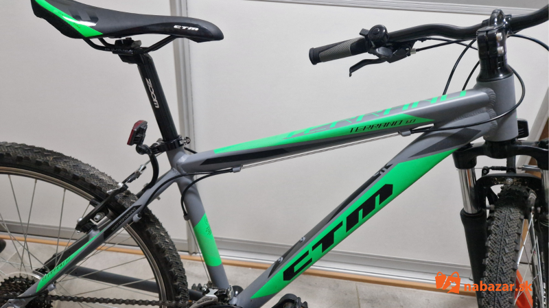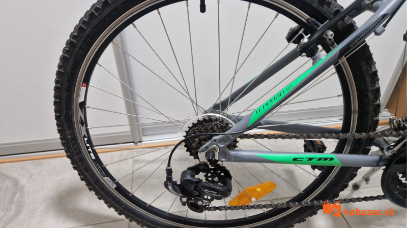 Predám veľmi málo používaný, ako nový juniorský bicykel 16" CTM Terrano 1.0 matná šedá/zelená. CTM Terrano 1.0 je horský bicykel vhodný na rekreačné a víkendové použitie. Ľahký hliníkový rám je vybavený odpruženou vidlicou Suntour, komponentmi Shimano s prevodmi 3x7 a ráfikovými brzdami ALHONGA. Rám je veľkosť M čiže 16", vhodné pre výšku postavy 150 - 165 cm, kolesá sú 26 palcové