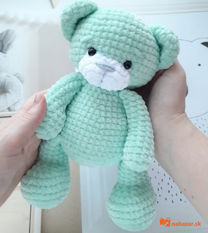 Háčkovaný macko v svetlomodrej farby, výška 20 cm