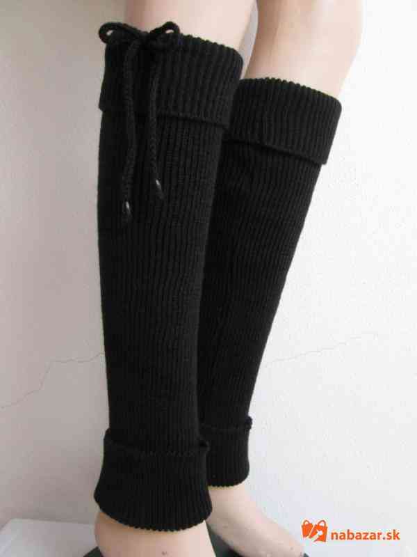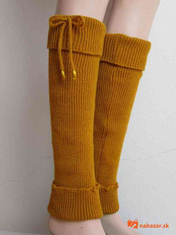 Návleky jsou upleteny pružným vzorem, nahoře je šňůrka na stažení a zároveň návleky zdobí. Na konci šňůrky jsou lakované dřevěné korálky. Mašlička může být vpředu nebo po straně. Návleky mají šev.