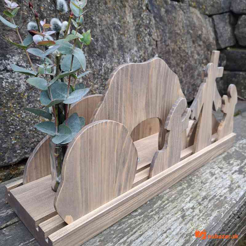 V drevenom masívnom podstavci sú vyfrézované drážky, do ktorých sa vkladajú jednotlivé komponenty. V podstavci je vložená kovová mištička na čajovú sviečku, ktorá je súčasťou dekorácie a vázička, do ktorej si uložíte jarné vetvičky alebo kvety. Podstavec je natieraný olejom/voskom na prírodnej báze.