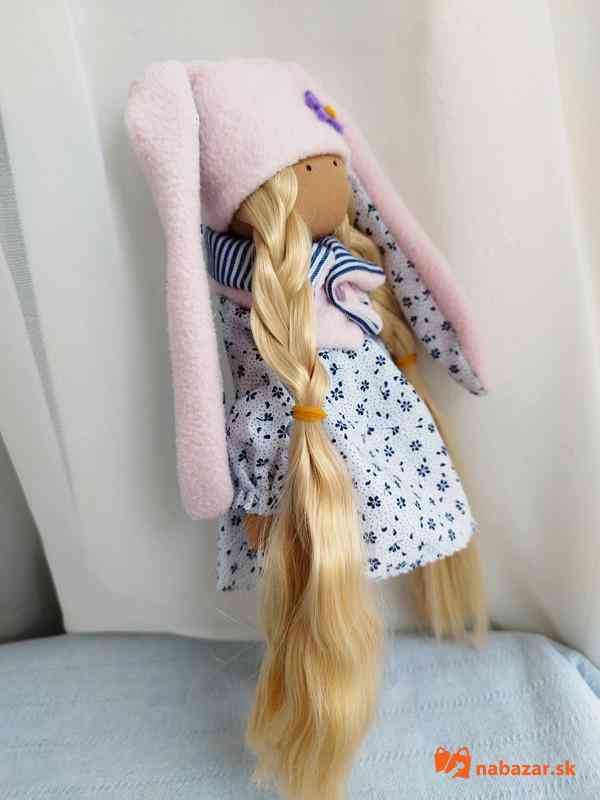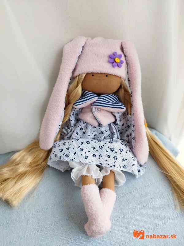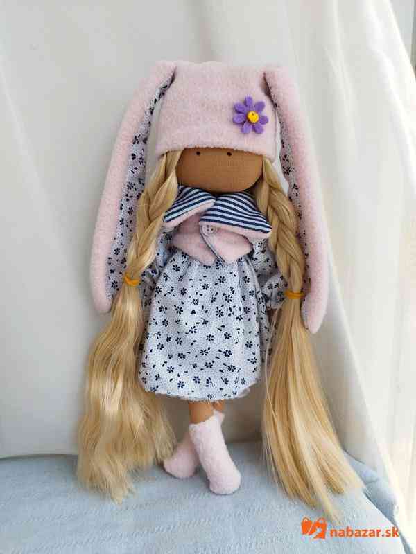 ????Textilná bábika v podobe zajačika s dlhými ušami na klobúku aký ešte ozdobné kvetom.
