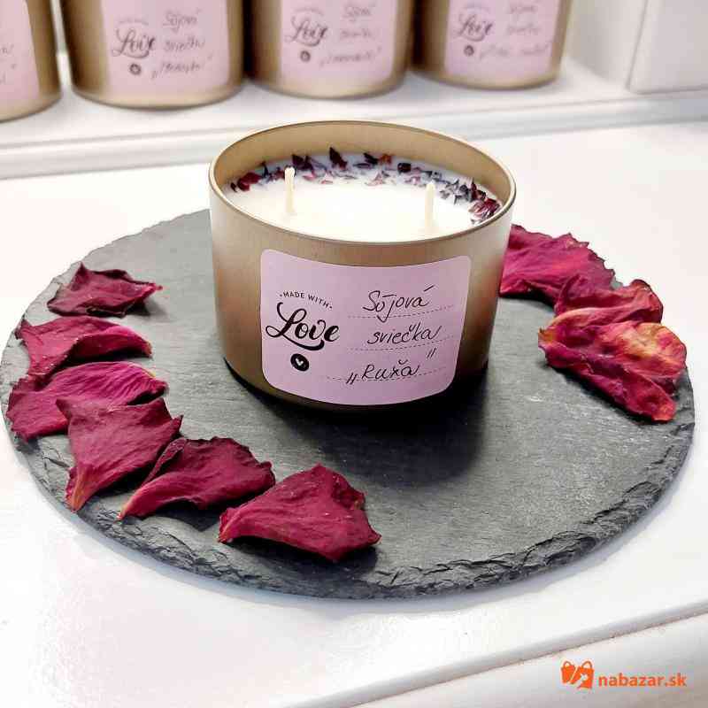 Ručne odlievaná sójová sviečka s vôňou Ruže a zdobená sušenými kvietkami z mojej záhrady.