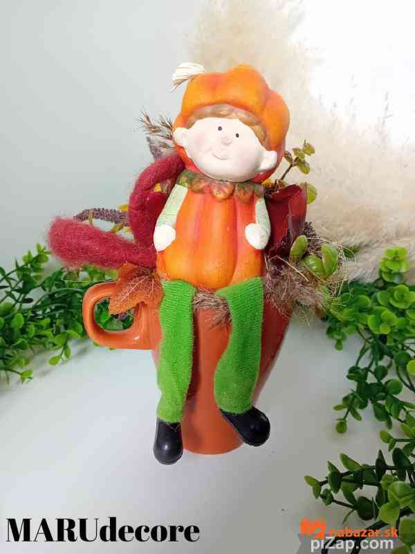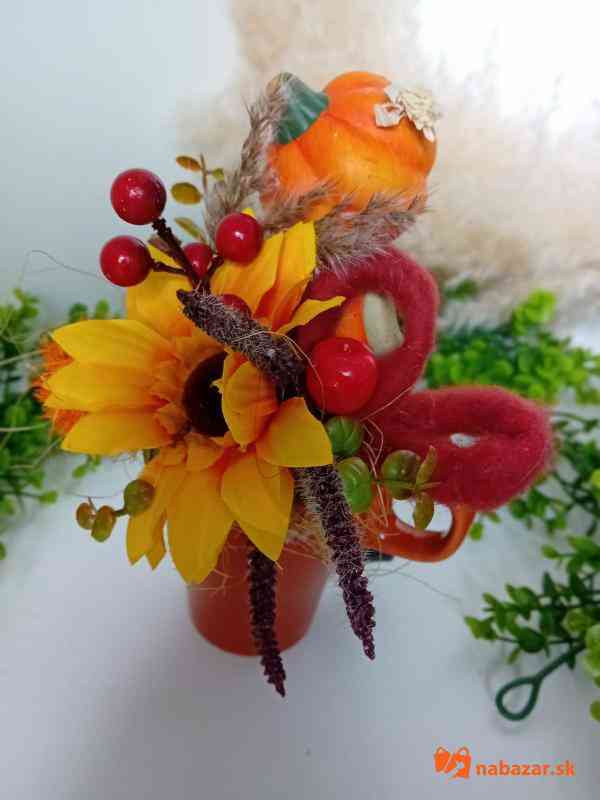 Jesenný aranžmán v šáločke, zdobený textilnými kvietkami, šiškami,aranžérskym materiálom a veselým tekvičiakom.