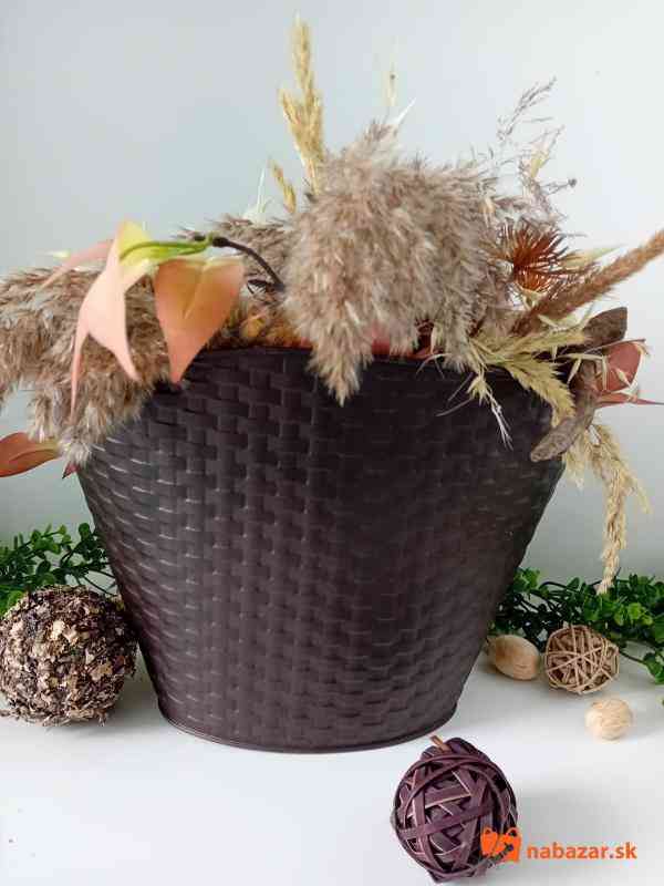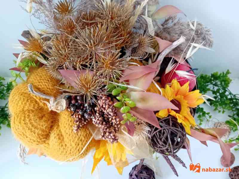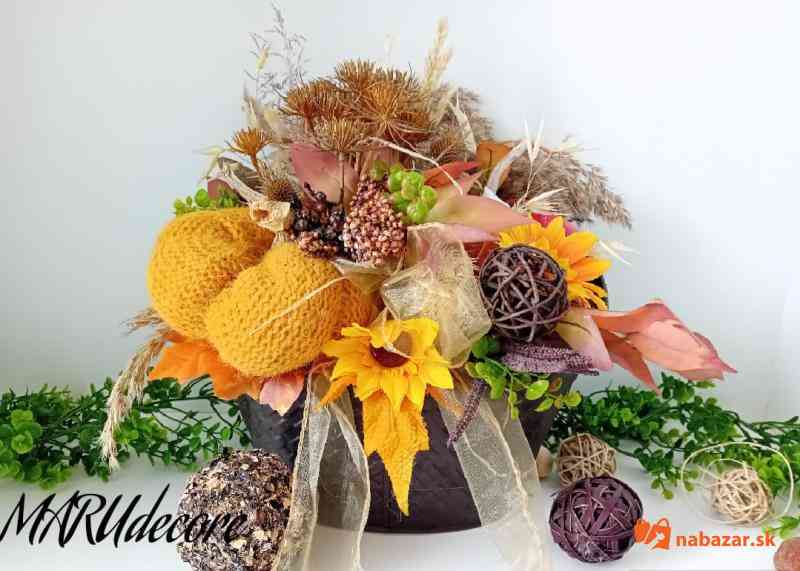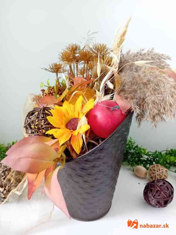 Jesenný aranžmán v kovoej nádobe, zdobený textilnými kvietkami, šiškami,aranžérskym materiálom a strikovanými tekvičkami .