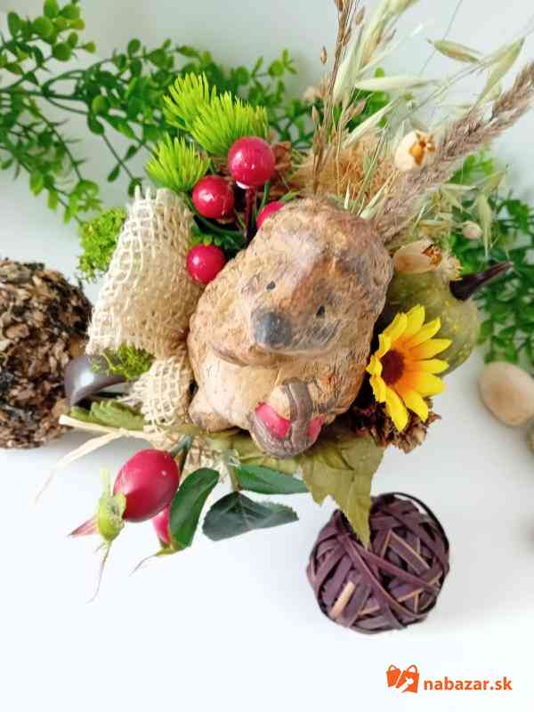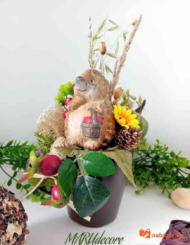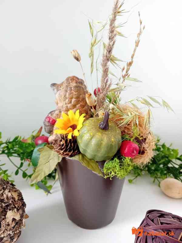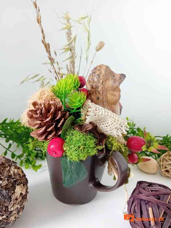 Jesenný aranžmán v šáločke, zdobený textilnými kvietkami, šiškami,aranžérskym materiálom a keramickým ježkom .
