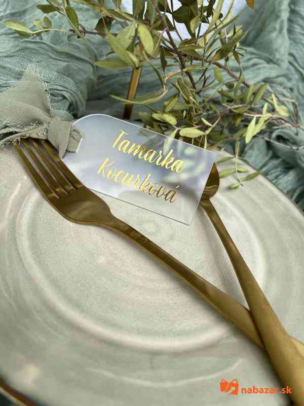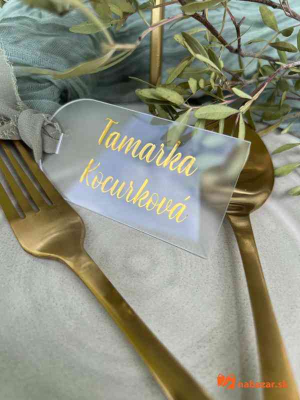 Svadobná menovka vyrobená z akrylu a samolepiacej nálepky. Možnosť zvoliť si akryl transparentný/matný,farbu nálepky: biela,čierna,zlatá Font: štýl písma by sme prebrali cez sociálne siete/email
