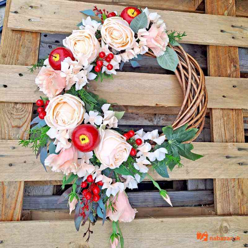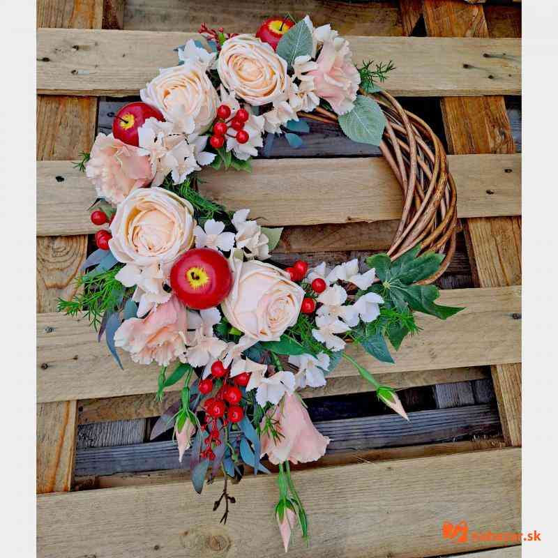 Venček na dvere bohato zdobený kvetmi a jabĺčkami.