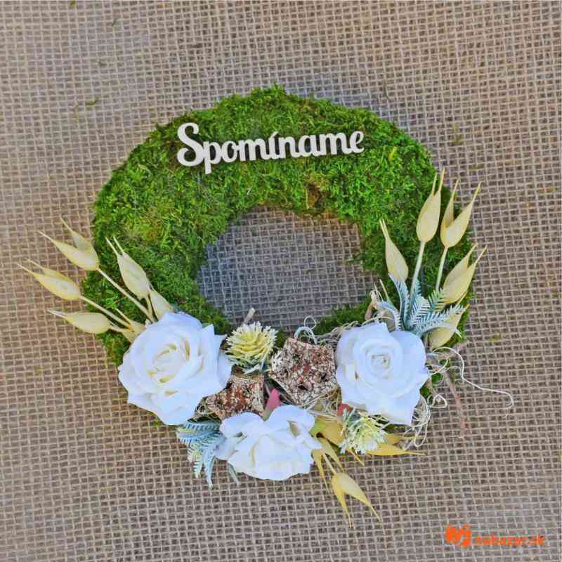 Machový venček na hrob ako spomienka dozdobený kvetmi.
