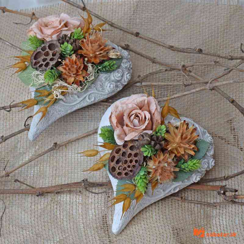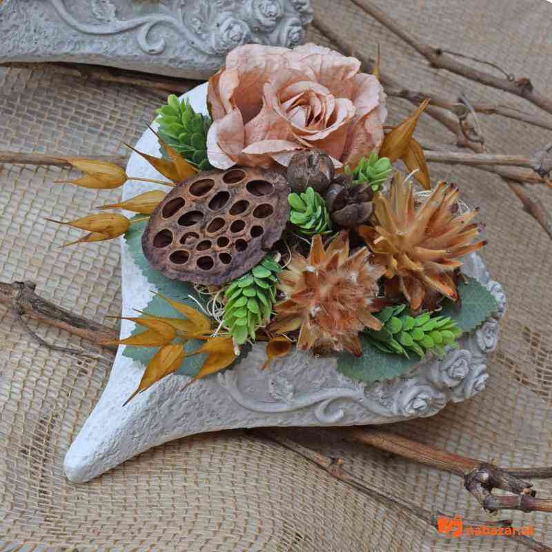 Betónová dekorácia na hrob dozdobená umelými a prírodnými kvetmi.