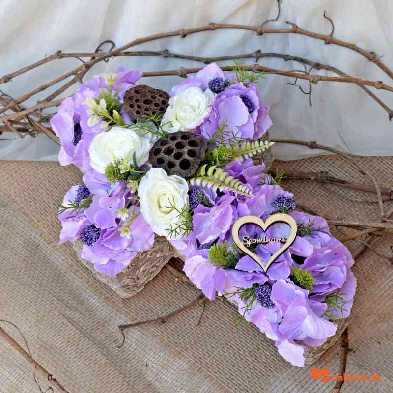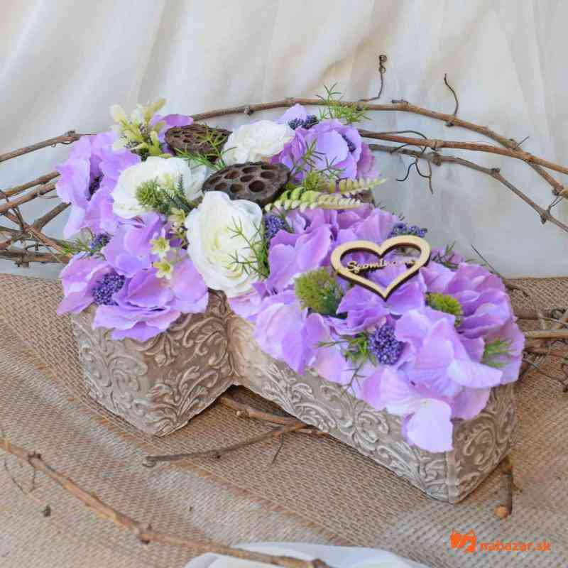 Betónová dekorácia na hrob dozdobená umelými kvetmi.