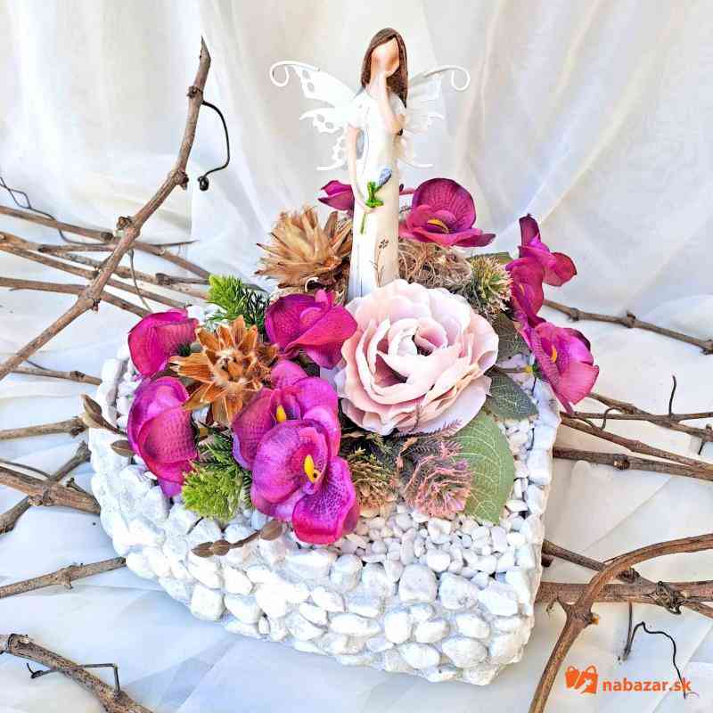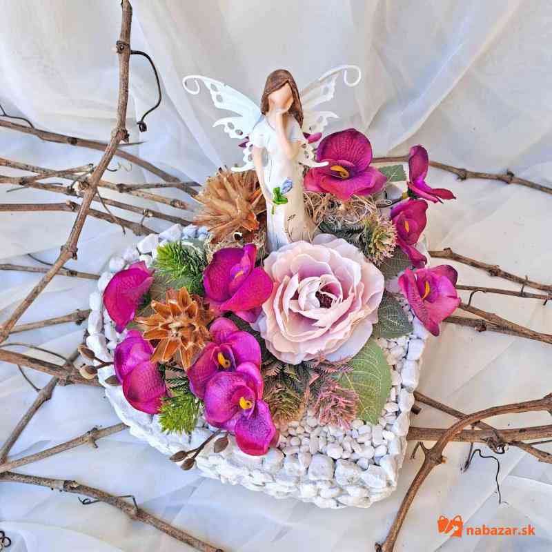 Betónová dekorácia na hrob dozdobená umelými kvetmi a anjelom