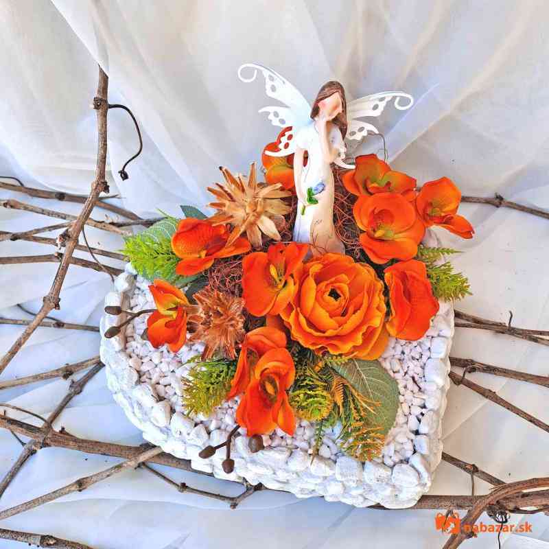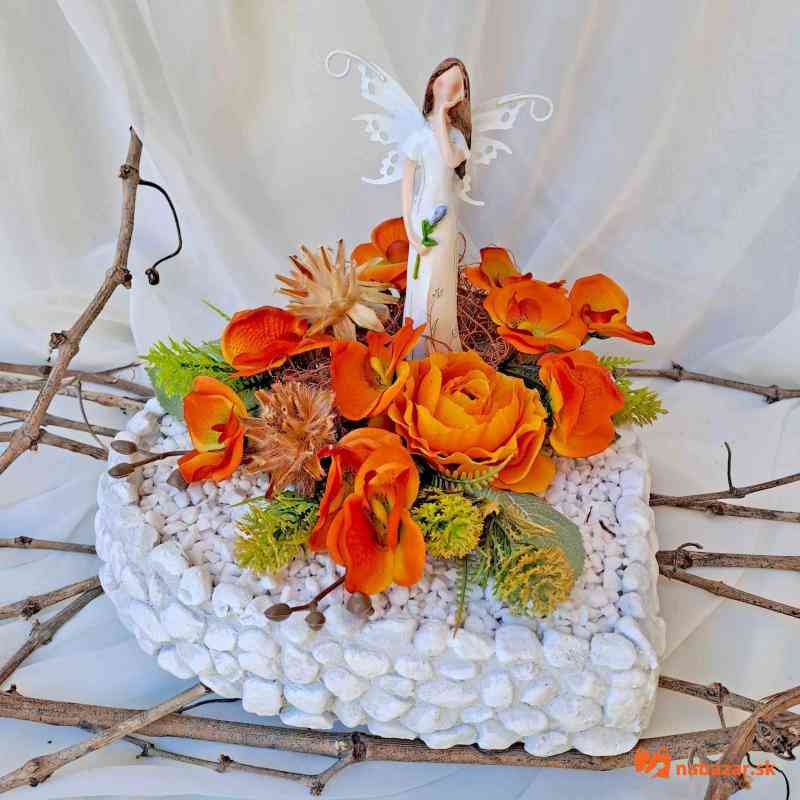 Betónová dekorácia na hrob dozdobená umelými kvetmi a anjelom