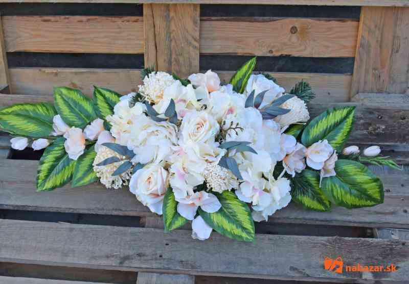 Spomienkový veniec na hrob z umelej čečiny dozdobený umelými kvetmi. Nádoba je zaťažená betónom.