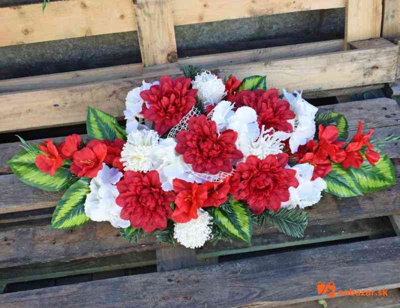 Spomienkový veniec na hrob z umelej čečiny dozdobený umelými kvetmi. Nádoba je zaťažená betónom.