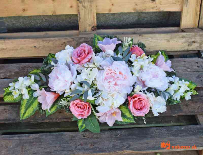 Spomienkový veniec na hrob z umelej čečiny dozdobený umelými kvetmi. Nádoba je zaťažená betónom.