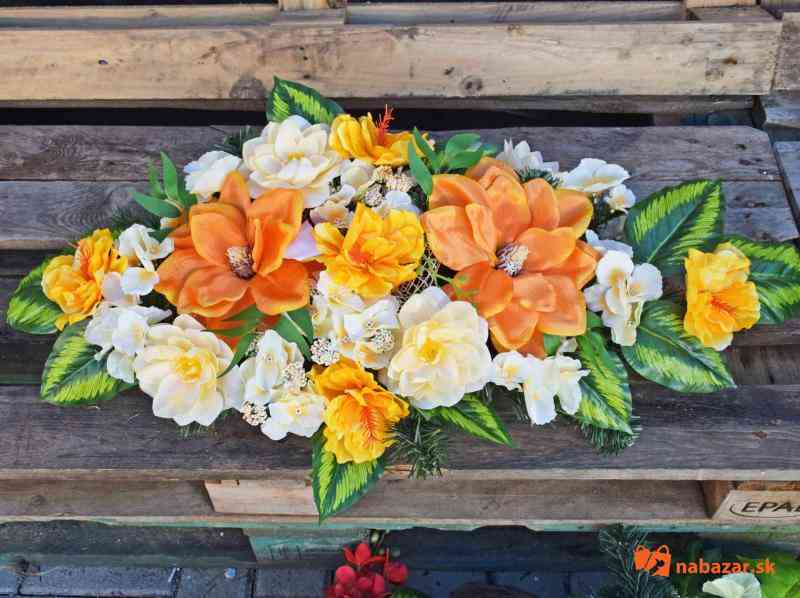Spomienkový veniec na hrob z umelej čečiny dozdobený umelými kvetmi. Nádoba je zaťažená betónom.