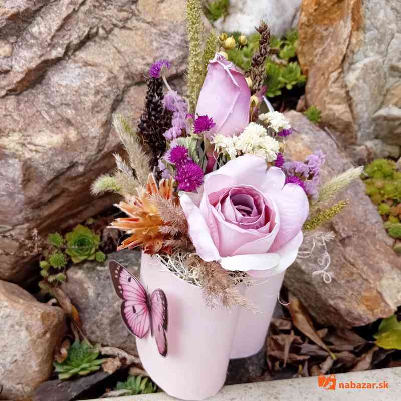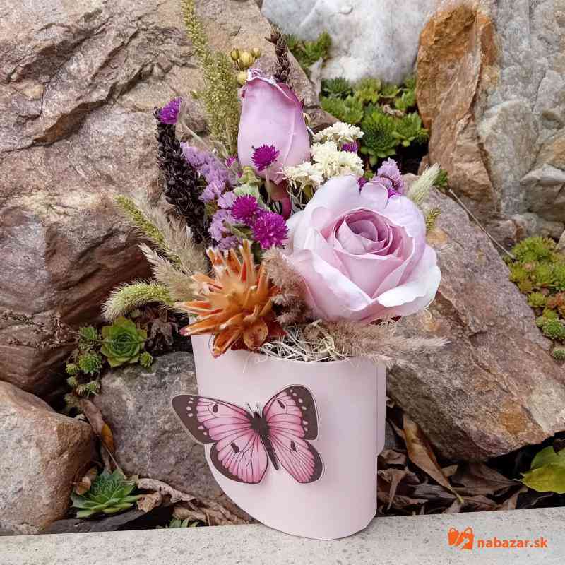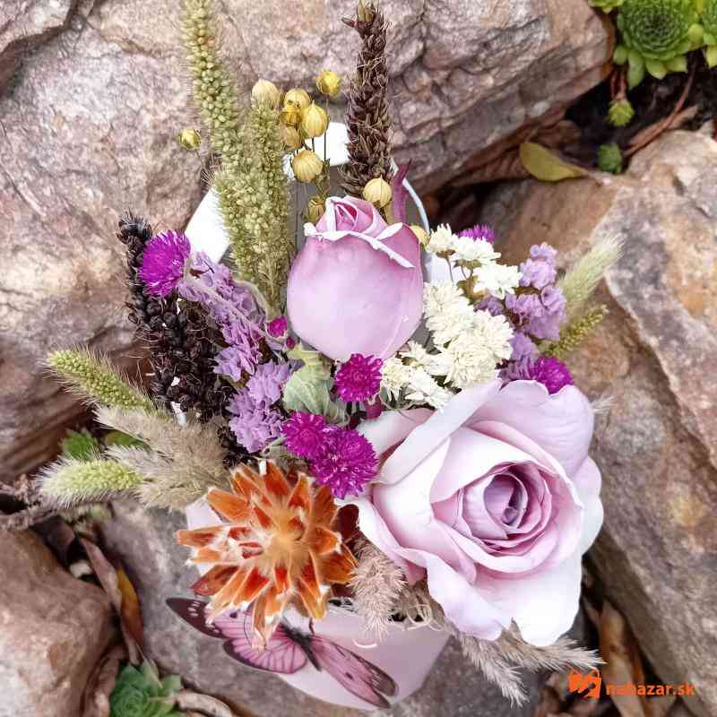 Dekoračný box dozdobený sušenými kvetmi a umelými ružami imitujúcimi sušený kvet